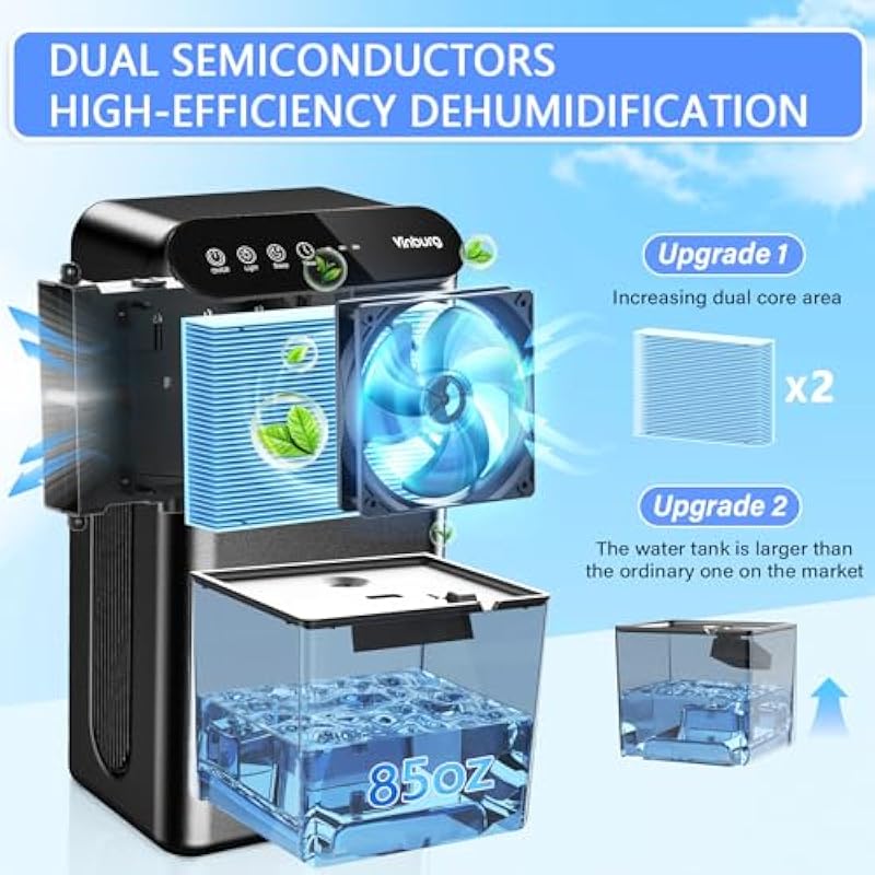 - 【Upgraded Dual-Core Semiconductor Dehumidifier】Equipped with advanced dual-core semiconductor condensation technology, this home dehumidifier efficiently removes excess moisture from indoor air. Ideal for bedrooms, bathrooms, closets, basements, and RVs, it helps maintain a comfortable and healthy environment. For best results, keep doors and windows closed during use.