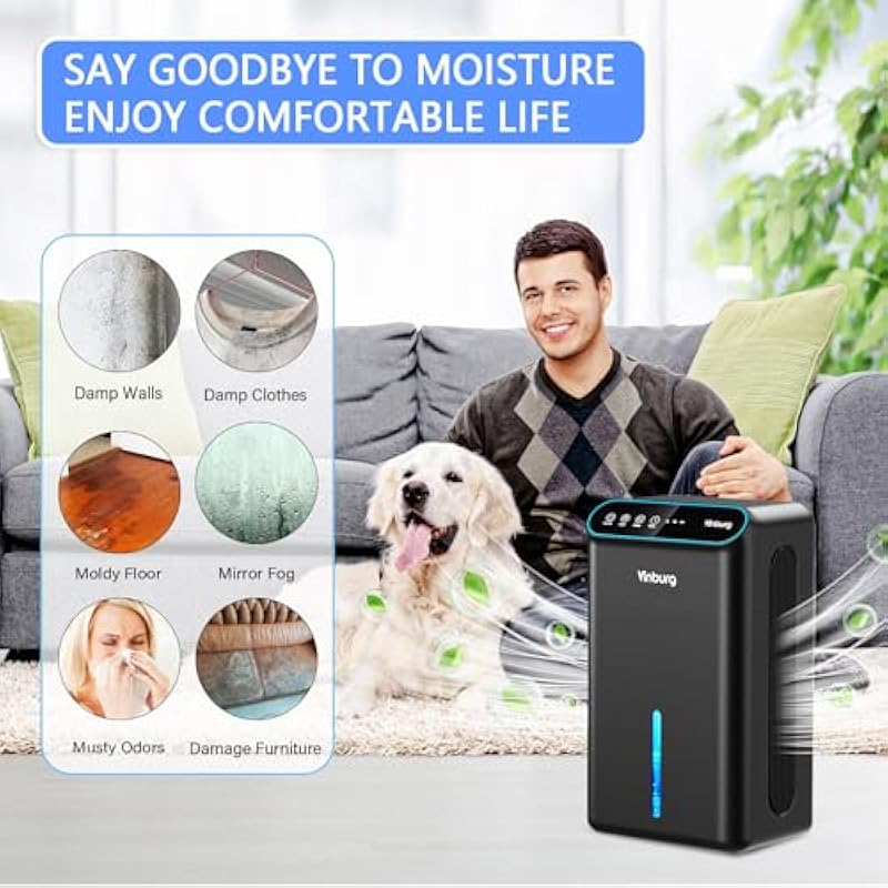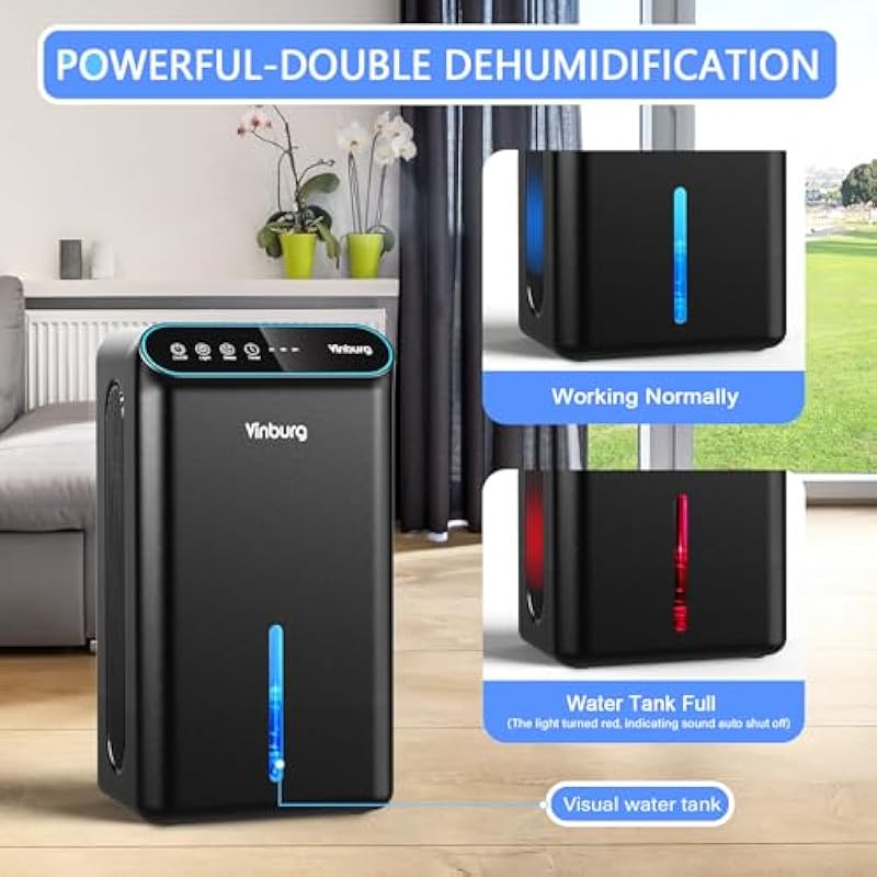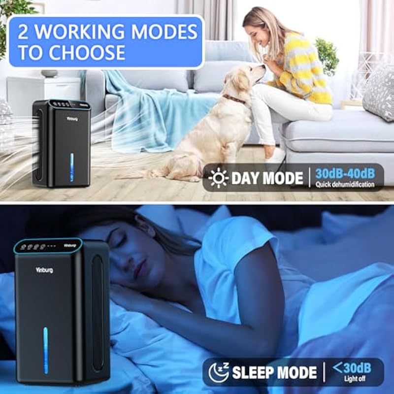 - 【Day & Sleep Mode with Whisper-Quiet Operation】This smart dehumidifier features two modes for all-day comfort. Day Mode delivers powerful moisture removal during active hours, while Sleep Mode lowers fan speed and noise to below 30 dB, turns off the lights, and creates a calm, undisturbed atmosphere—perfect for bedrooms, nurseries, and quiet workspaces.
