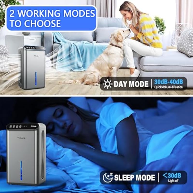 - 【Day & Sleep Mode with Whisper-Quiet Operation】This smart dehumidifier features two modes for all-day comfort. Day Mode delivers powerful moisture removal during active hours, while Sleep Mode lowers fan speed and noise to below 30 dB, turns off the lights, and creates a calm, undisturbed atmosphere—perfect for bedrooms, nurseries, and quiet workspaces.