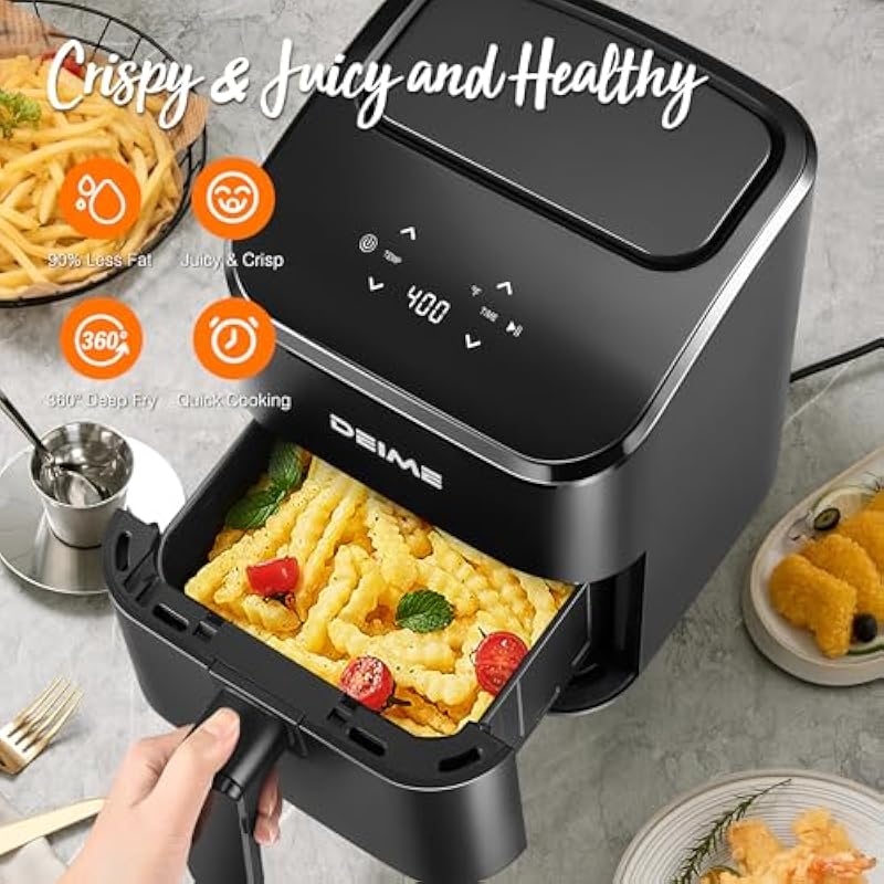- FAST & EASY: Little to no preheating time, from frozen to golden in minutes! The 3-quart DEIME air fryer touchscreen display can customize your cooking time and temperature up to a maximum of 400°F! With toast rack!