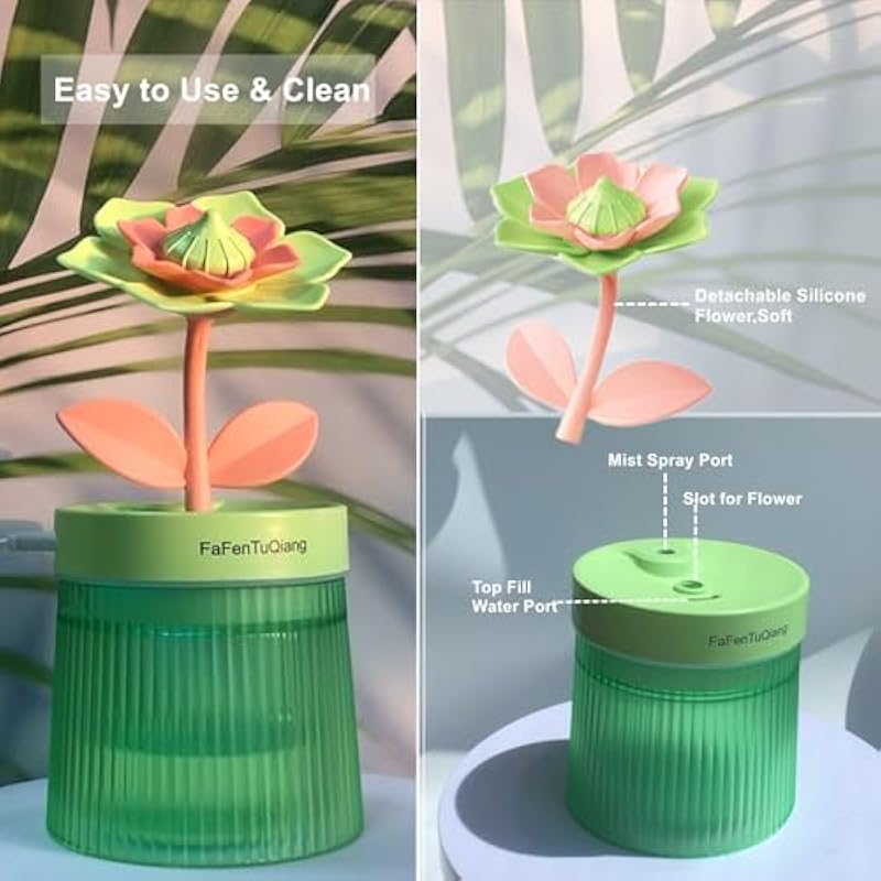 - Bionic Watering Flower Add Water:The 7 colors night light mini humidifier with creative design, a pretty flower.It is a high quality desk small humidifier, looks like a potted plants, let you mimic bionic watering flowers, top fill water without open the lid, lively and funny