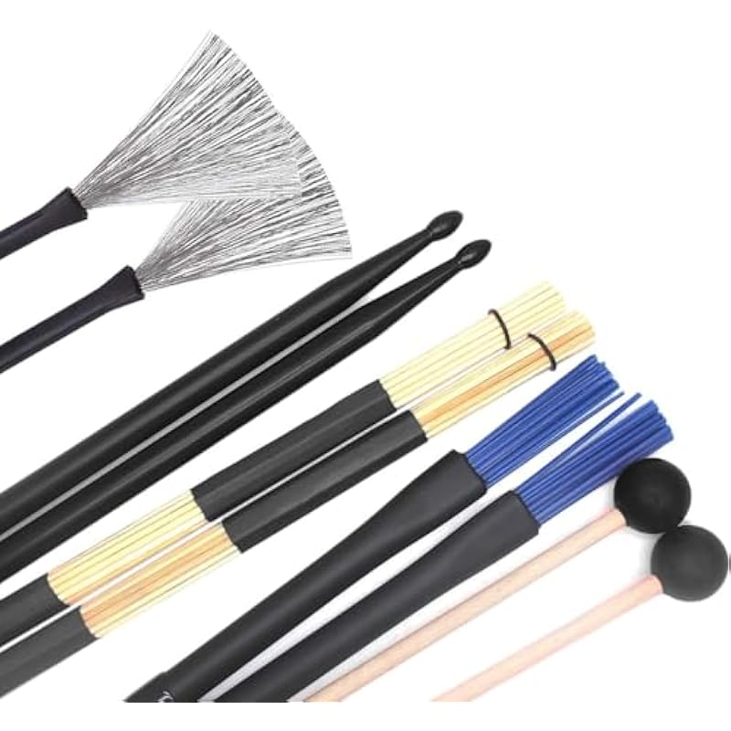 - Package Includes – 1 Pair Rubber Mallet, 1 Pair Bamboo Drum Sticks,1 Pair Black Drumsticks,1 Pair Jazz Nylon Brushes, 1 Pair Metal Wire Drum Brushes, Comes with drum sticks bag holder, it’s helpful to store and carry the drum brushes set.