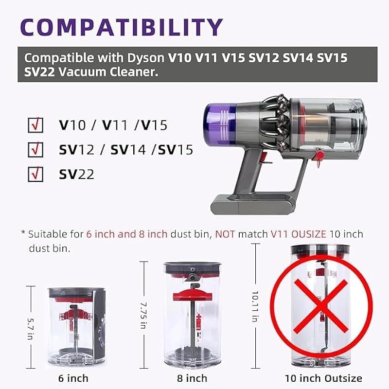- Compatibility Model: The bin lid replacement suitable for Dyson V10 V11 V15 SV12 SV14 SV15 SV22 vacuum cleaner, please double-check your vacuum cleaner’s model and dust bin size
