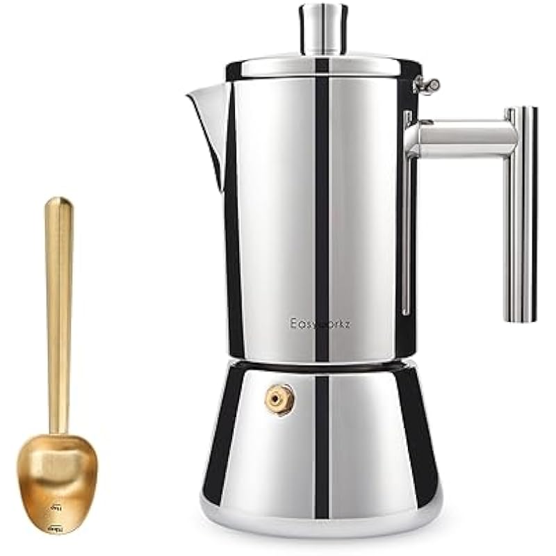 - [Premium Quality 18/8 Stainless Steel Moka Coffee Pot] Made of 18/8 Stainless Steel with high mirror polishing processed. The ability of anti-rust and corrosion is also the best. Can be used for all kinds of heat resource, such as gas stove , induction burner , electric cooktop.Easy to clean and disassemble. Dishwasher safe.