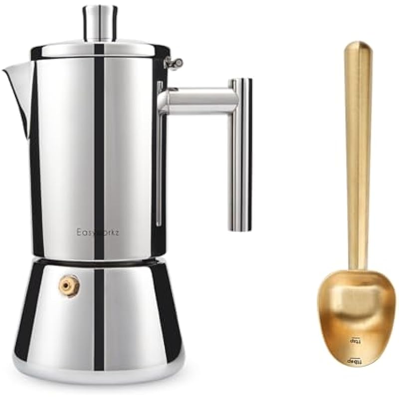 Easyworkz Diego Stovetop Espresso Maker 4Cup 6.8 oz Moka Pot, Bundled with Stainless Steel Long Hollow Handle 7g Measuring Spoon, Brass Gold