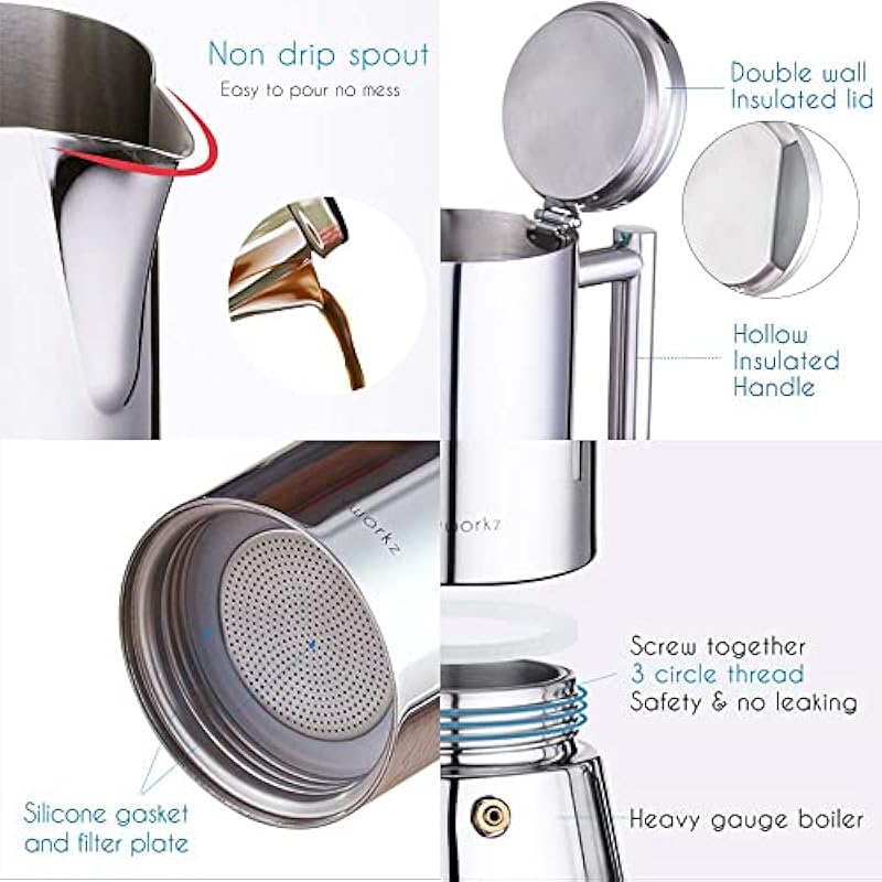 - Used the latest manufacturing technology and combined aesthetics to design this elegant espresso coffee pot. The heat resistant hollow insulated lid and handle grip make it convenient to use. Base is heavy gauge Magnetic stainless steel,ensuring its long life time at high temperatured heat resource.