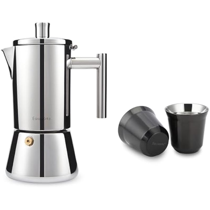 Easyworkz Diego Stovetop Espresso Maker, Bundled With Stainless Steel Espresso Cup 2pcs Set Double Wall Insulated Metal Demitasse Cups