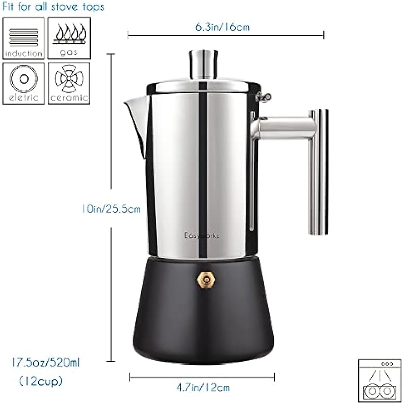 Easyworkz Diego Stovetop Espresso Maker Stainless Steel 12Cup 17.5 oz Induction Moka Pot, Bundled Stainless Steel 304 Creamer and Sugar Bowl with Spoon Coffee Serving Set Chrome
