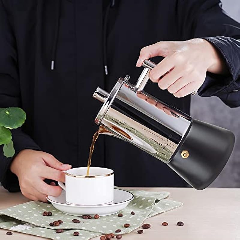 - [Elegant and Heat Resistant Design] Used the latest manufacturing technology and combined aesthetics to design this elegant espresso coffee pot. The heat resistant hollow insulated lid and handle grip make it convenient to use. Base is non-stick high temperatured black hard-wearing coating, ensuring its long life time at high temperatured heat resource.