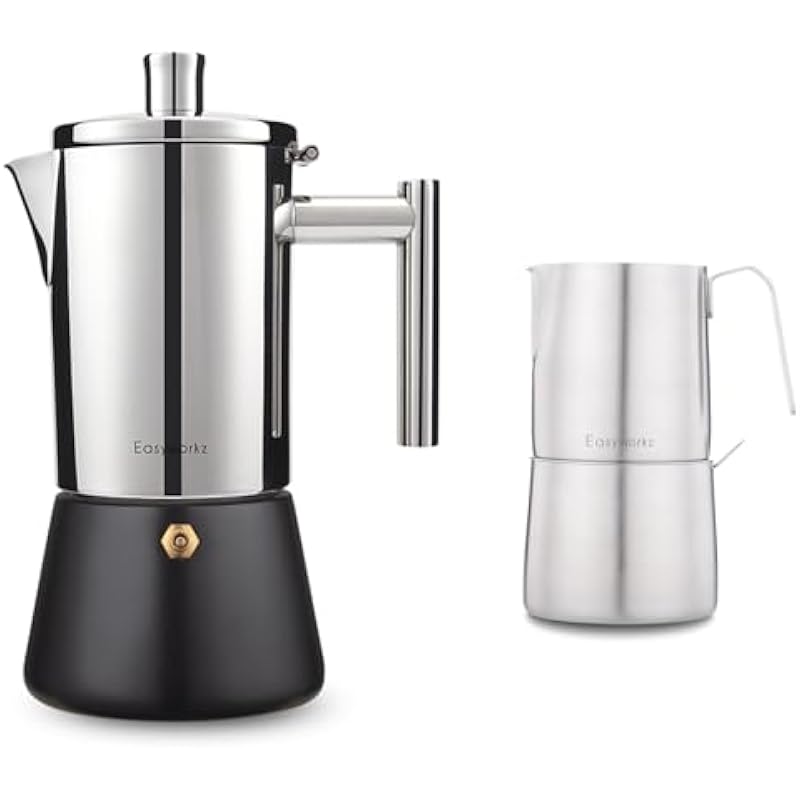 Easyworkz Diego Stovetop Espresso Maker Stainless Steel 12Cup 17.5 oz Induction Moka Pot, Bundled with Stainless Steel 304 Creamer and Sugar Bowl with Spoon Coffee Serving Set, Brushed Silver