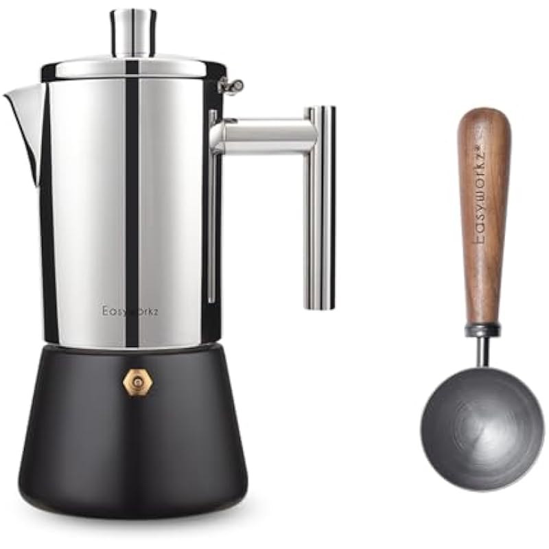 Easyworkz Diego Stovetop Espresso Maker Stainless Steel 4Cup 6.8 oz Induction Moka Pot, Bundled with Retro Stainless Steel Coffee Spoon With Black Walnut Handle,10g – Measuring Spoon (Gunmetal)
