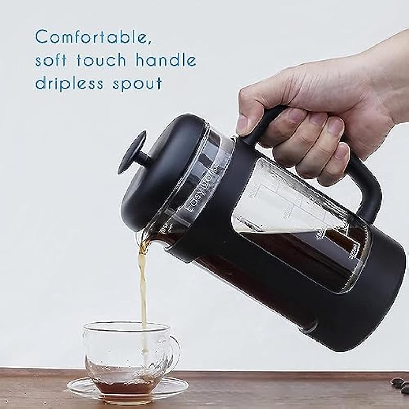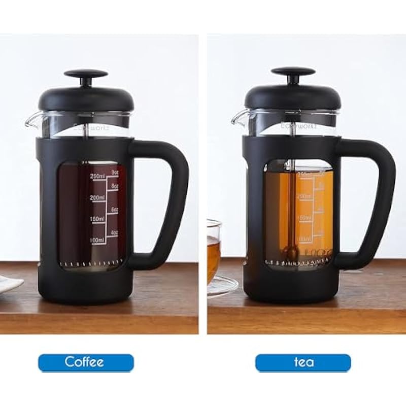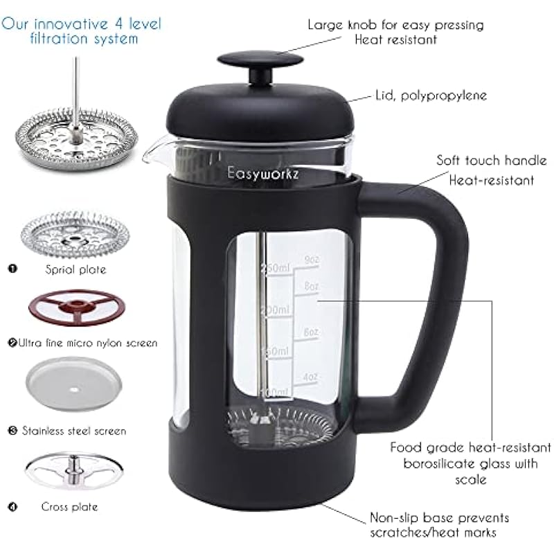 - Used the latest manufacturing technology and combined aesthetics to design this elegant french coffee pot, tea pot .With the 4 levels extra fine micro stainless steel mesh filter, you could brew your coffee or tea with the filter, to get a better taste without the coffee grounds mixing in your coffee.