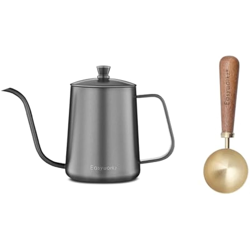 Easyworkz Gage Gooseneck Pour Over Coffee Kettle 12 oz (Black), Bundled with Easyworkz Retro Stainless Steel Coffee Spoon With Black Walnut Handle,10g – Measuring Spoon (Brushed gold)