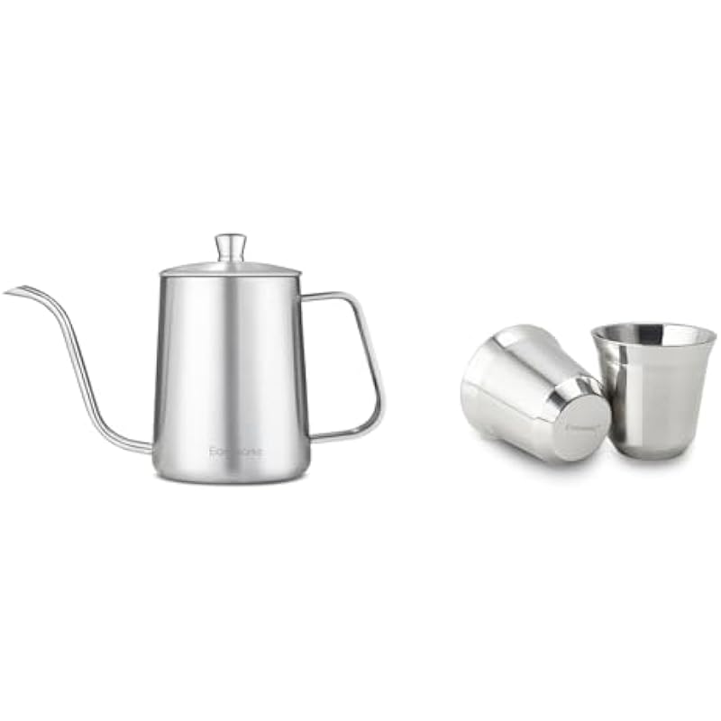Easyworkz Gage Gooseneck Pour Over Coffee Kettle 12 oz, Silver, Bundled with Easyworkz Stainless Steel Espresso Cup 2pcs Set Double Wall Insulated Metal Demitasse Cups 2.5 oz