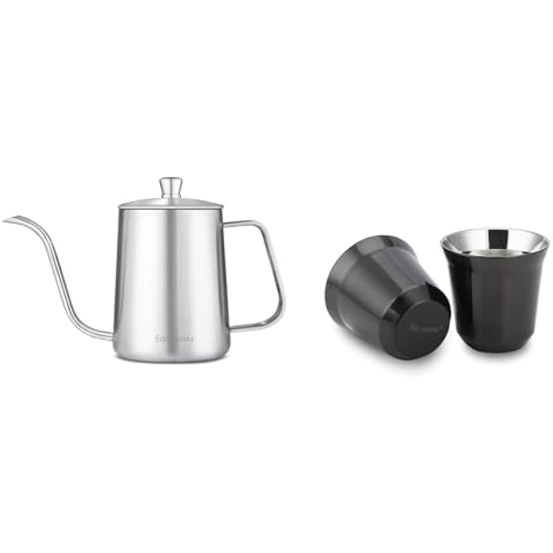 Easyworkz Gage Gooseneck Pour Over Coffee Kettle 12 oz, Silver, Bundled with Easyworkz Stainless Steel Espresso Cup 2pcs Set Double Wall Insulated Metal Demitasse Cups 5 oz