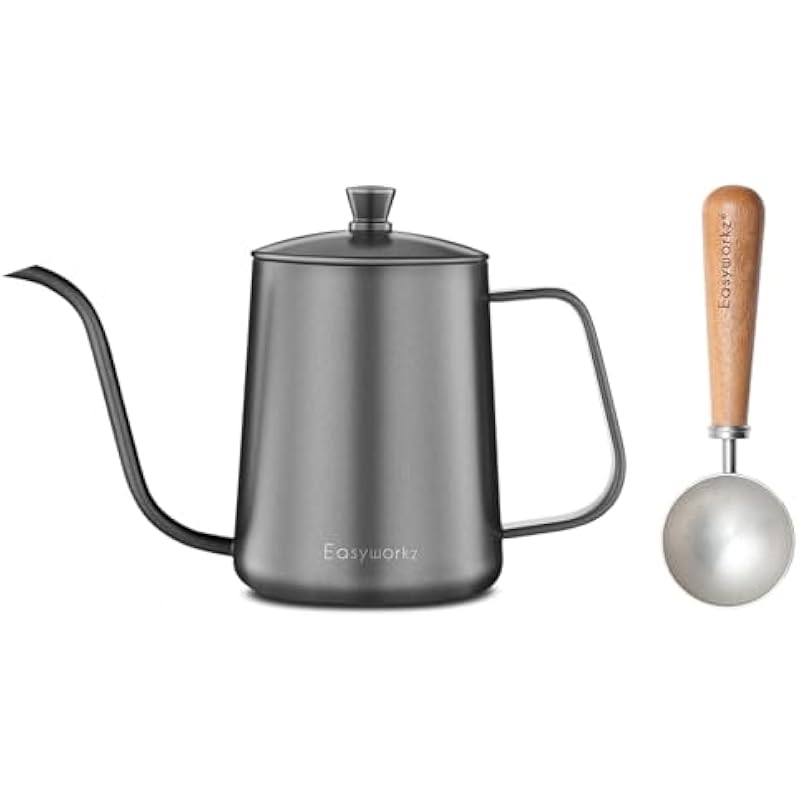 Easyworkz Gage Gooseneck Pour Over Coffee Kettle 20 oz (Black), Bundled with Easyworkz Retro Stainless Steel Coffee Spoon with Black Walnut Handle,10g – Measuring Spoon