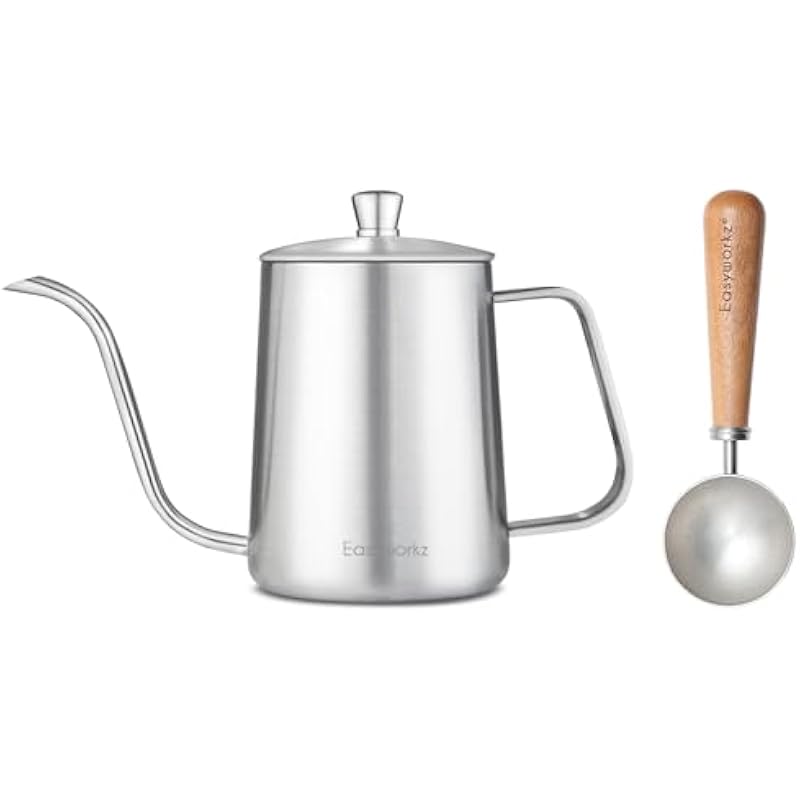 Easyworkz Gage Gooseneck Pour Over Coffee Kettle 20 oz (Silver), Bundled with Easyworkz Retro Stainless Steel Coffee Spoon with Black Walnut Handle,10g – Measuring Spoon