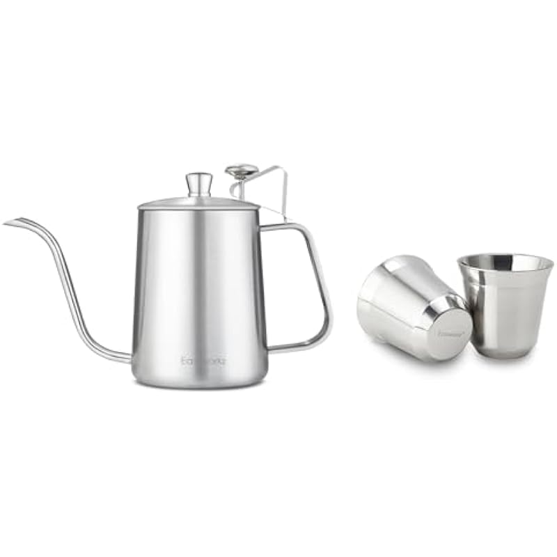 Easyworkz Gage Gooseneck Pour Over Coffee Kettle 20 oz with Thermometer, Silver, Bundled with Easyworkz Stainless Steel Espresso Cup 2pcs Set Double Wall Insulated Metal Demitasse Cups 5 oz