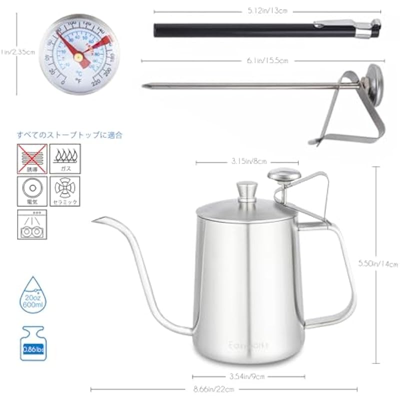 - [Excellent Design] Ergonomic ear shape handle is designed for comfortable and safe grip to avoid scalding with pouring boiling water.The compact size makes cleaning easy.Kettle lid integrated thermometer allows you to brew your coffee at the optimal temperature.