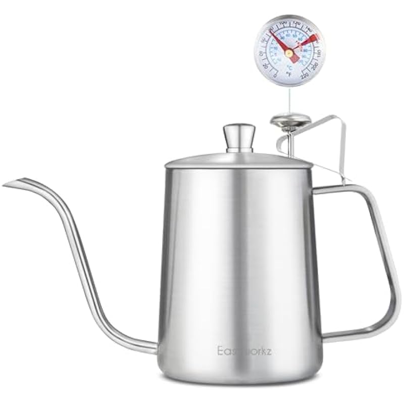 Easyworkz Gage Gooseneck Pour Over Coffee Kettle 20 oz with Thermometer Stainless Steel Hand Drip Coffee Pot With Long Narrow Spout, Silver