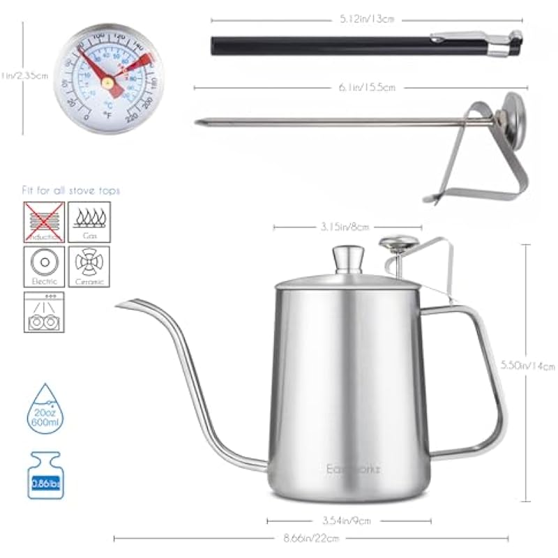 - [Excellent Design] Ergonomic ear shape handle is designed for comfortable and safe grip to avoid scalding with pouring boiling water.The compact size makes cleaning easy.Kettle lid integrated thermometer allows you to brew your coffee at the optimal temperature.
