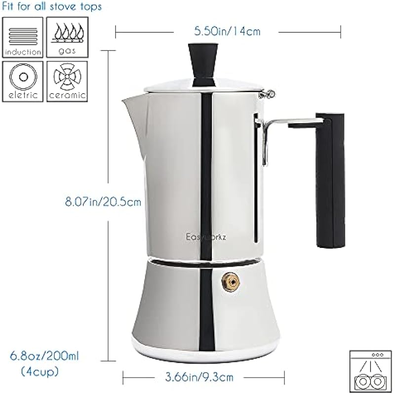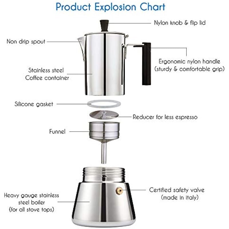 - Used the latest manufacturing technology and combined aesthetics to design this elegant espresso coffee pot. The heat resistant plastic knob and handle grip make it convenient to use. Base is heavy gauge Magnetic stainless steel,ensuring its long life time at high temperatured heat resource.