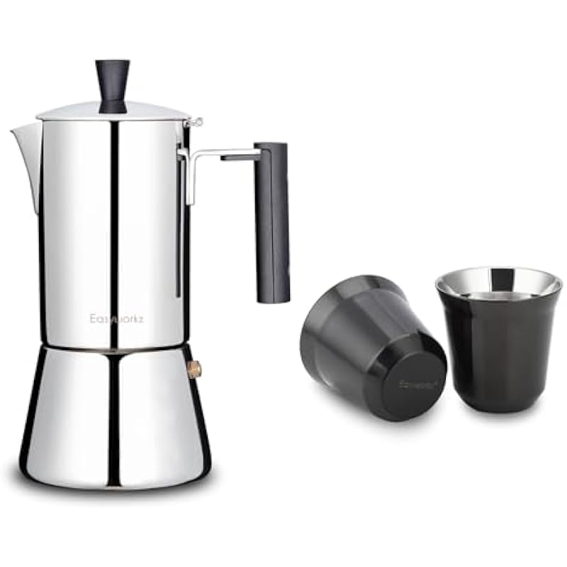 Easyworkz Pedro Stovetop Espresso Maker 4Cup 200ml, Bundled Stainless Steel Espresso Cup 2pcs Set Double Wall Insulated Metal Demitasse Cups 5 oz