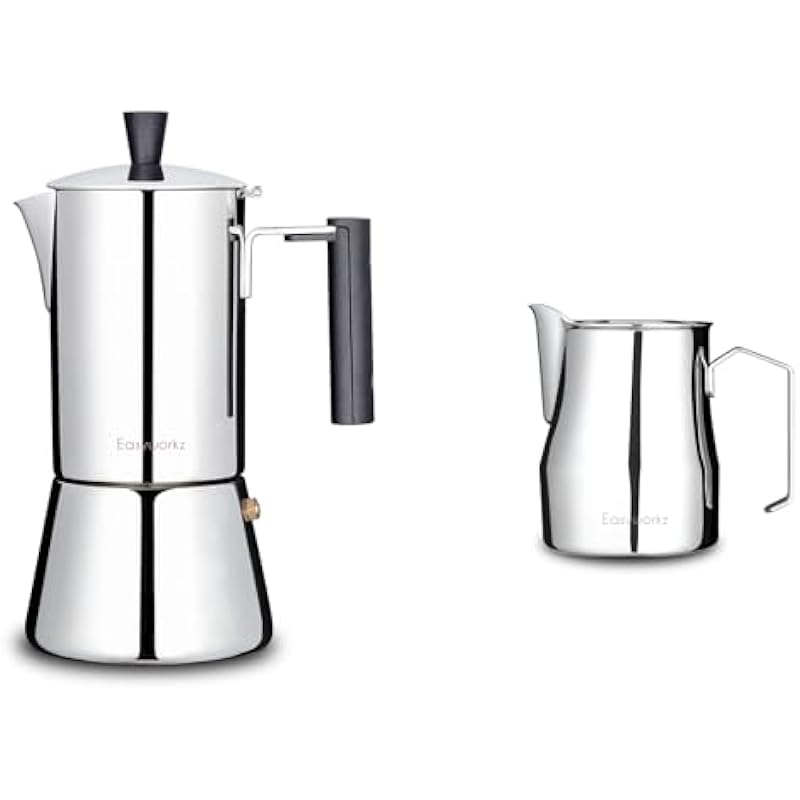 Easyworkz Pedro Stovetop Espresso Maker 6Cup 300ml, Bundled Espresso Steaming Pitcher Stainless Steel 12 oz Coffee Frothing Picther Milk Jug Cappuccino Latte Art Cup