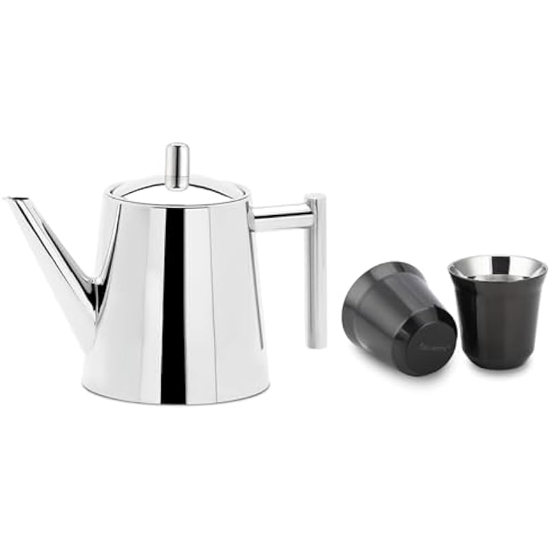 Easyworkz Stainless Steel Double Wall 34 oz Tea Pot with Removable Tea Infuser, Bundled with Easyworkz Stainless Steel Espresso Cup 2pcs Set Double Wall Insulated Metal Demitasse Cups (Black, 5 oz)