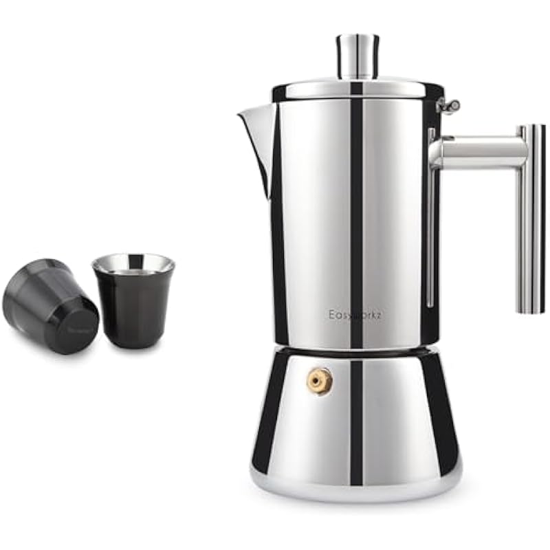 Easyworkz Stainless Steel Espresso Cup 2pcs Set Double Wall 2.5 oz, Bundled with Diego Stovetop Espresso Maker Stainless Steel Italian Coffee Machine Maker 12Cup 17.5 oz Induction Moka Pot