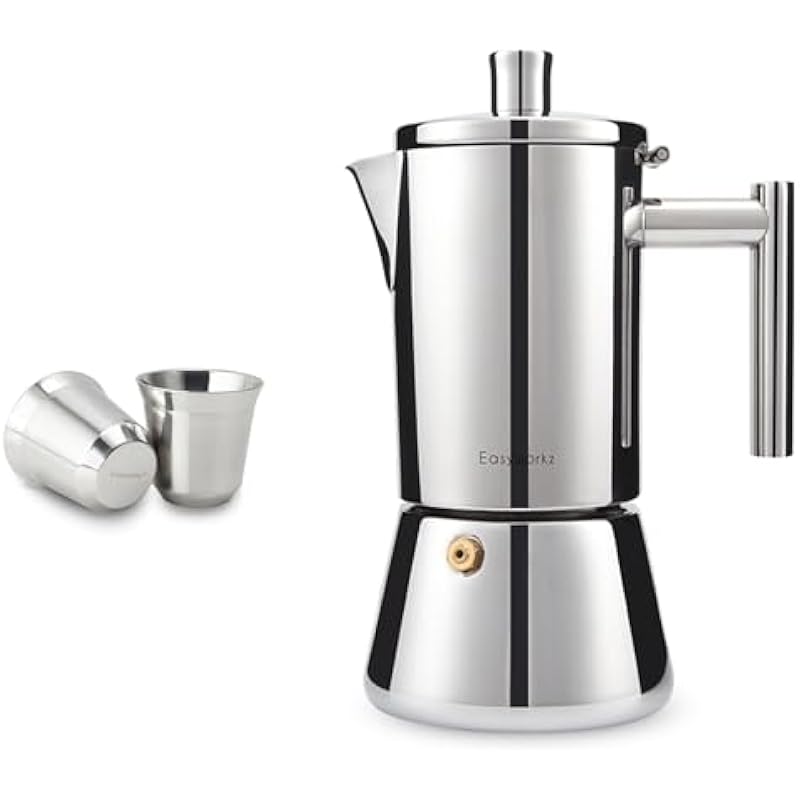 Easyworkz Stainless Steel Espresso Cup 2pcs Set Double Wall (Silver, 2.5 oz), Bundled with Diego Stovetop Espresso Maker Stainless Steel Italian Coffee Machine Maker 12Cup 17.5 oz Induction Moka Pot