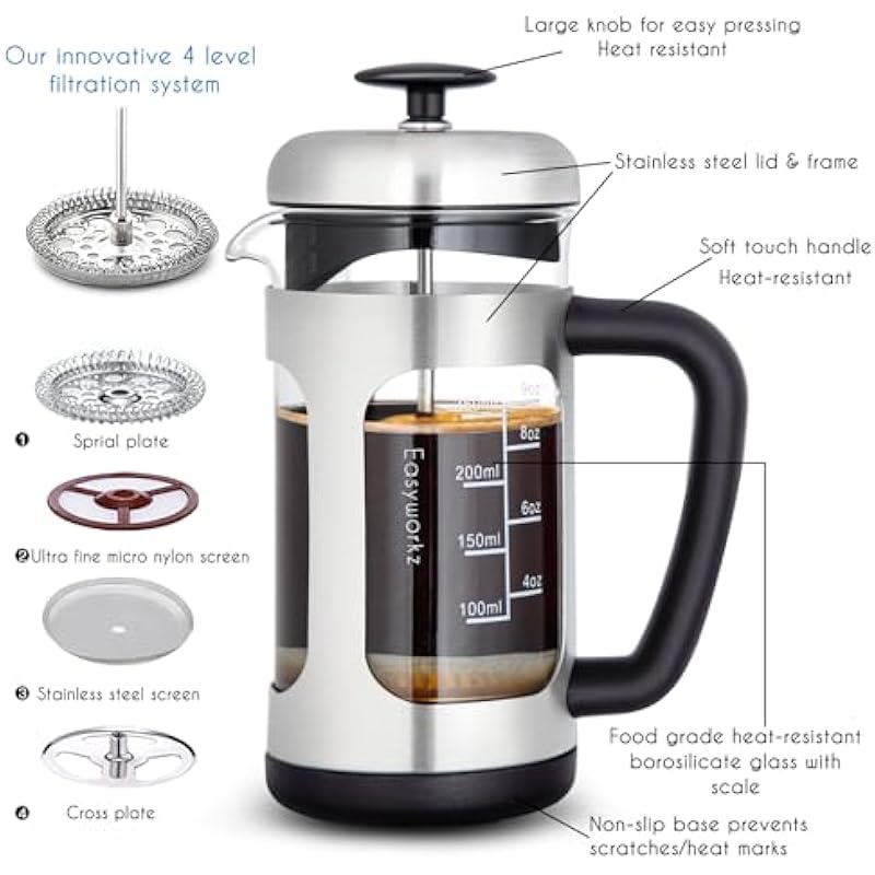 - [French Coffee Pot with Innovative 4 Level Filtration System] Used the latest manufacturing technology and combined aesthetics to design this elegant french coffee pot, tea pot .With the 4 levels extra fine micro stainless steel mesh filter, you could brew your coffee or tea with the filter, to get a better taste without the coffee grounds mixing in your coffee.