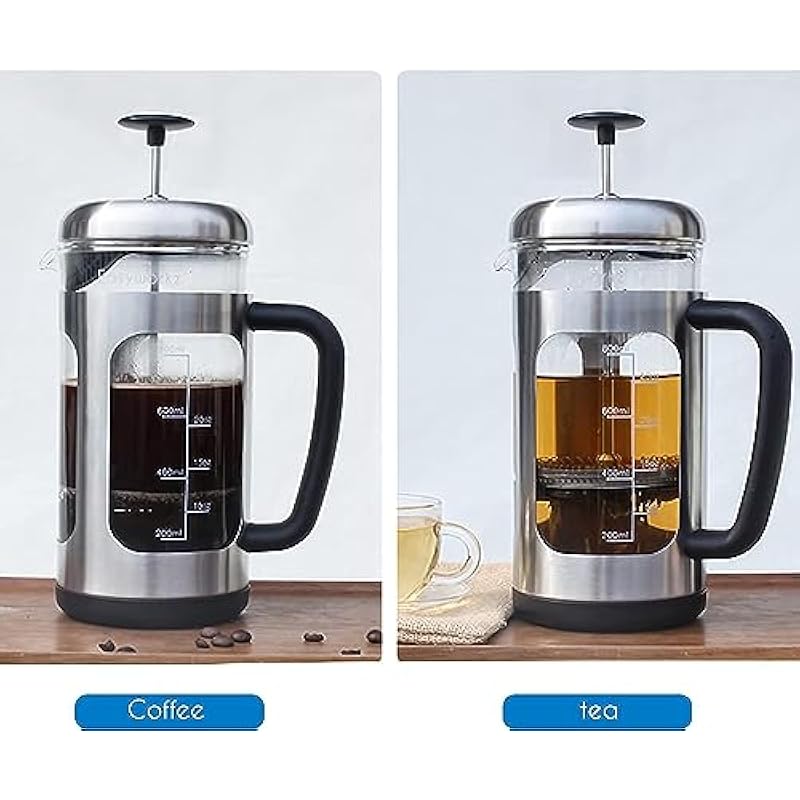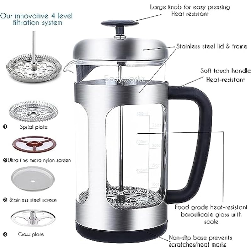 - [French Coffee Pot with Innovative 4 Level Filtration System] Used the latest manufacturing technology and combined aesthetics to design this elegant french coffee pot, tea pot .With the 4 levels extra fine micro stainless steel mesh filter, you could brew your coffee or tea with the filter, to get a better taste without the coffee grounds mixing in your coffee.