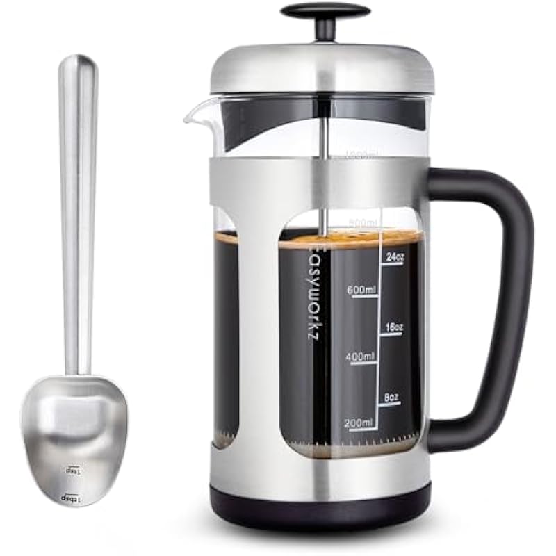 Easyworkz Stainless Steel Long Hollow Handle Coffee Scoop,7g Measuring Spoon, Brushed Silver, Bundled with Easyworkz Stainless Steel French Press 34 oz Coffee Tea Maker with Soft Grip Handle