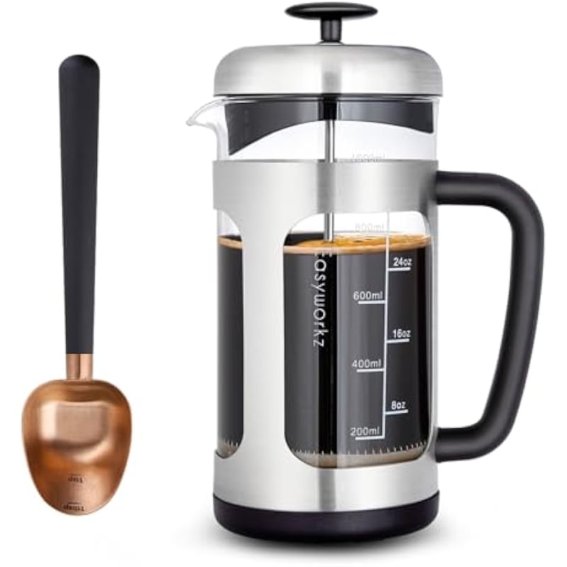Easyworkz Stainless Steel Long Hollow Handle Coffee Scoop,7g Measuring Spoon, Rose Gold-Black, Bundled with Easyworkz Stainless Steel French Press 34 oz Coffee Tea Maker with Soft Grip Handle