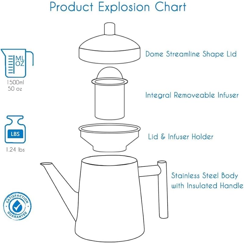 - Teapot made of stainless steel 304 with micro-etched tea infuser.50 oz capacity.