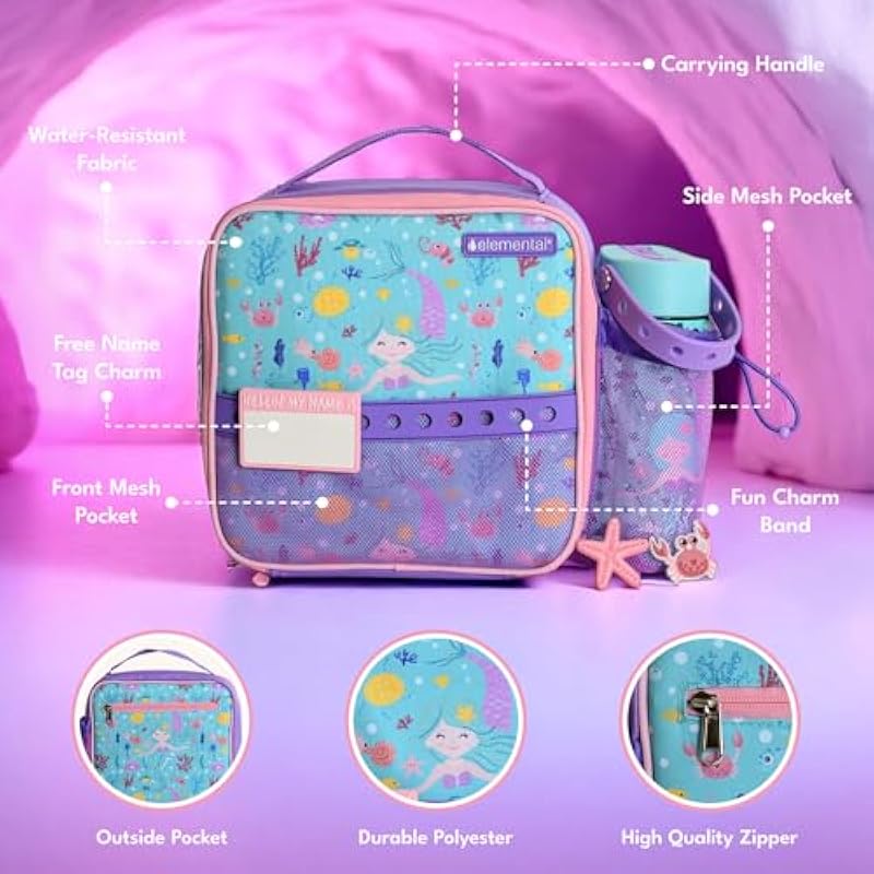 Elemental Insulated Lunch Bag for Kids, with Water Bottle Pocket & Charm Band, Fits Lunch Box, Lunch Bag for School to Keeps Food at Optimal Temperature, 3L – Mermaid