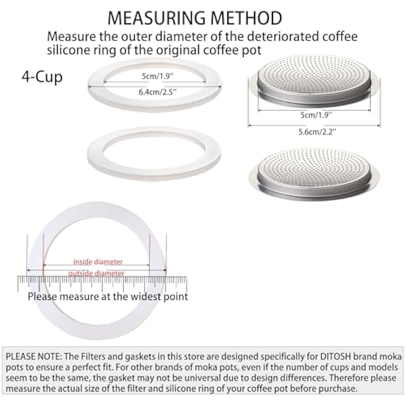 - Premium Materials & Sizes: The filter screens are made of high-quality stainless steel with an outer diameter of 2.2 inch. The silicone gaskets are made of food-grade, heat-resistant silicone with an outer diameter of 2.5 inch. Before making a purchase, please measure the size of your coffee pot’s filter and gasket to ensure a perfect fit. Note: Choose a filter made of the same material as your coffee pot