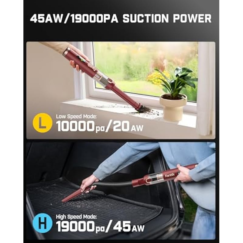 - Efficient Brushless Motor: Powered by a 120W brushless motor, it effectively removes dust, hair, and debris. Two modes provide up to 19,000Pa suction in high mode or 30 minutes runtime in low mode, adapting to different cleaning tasks