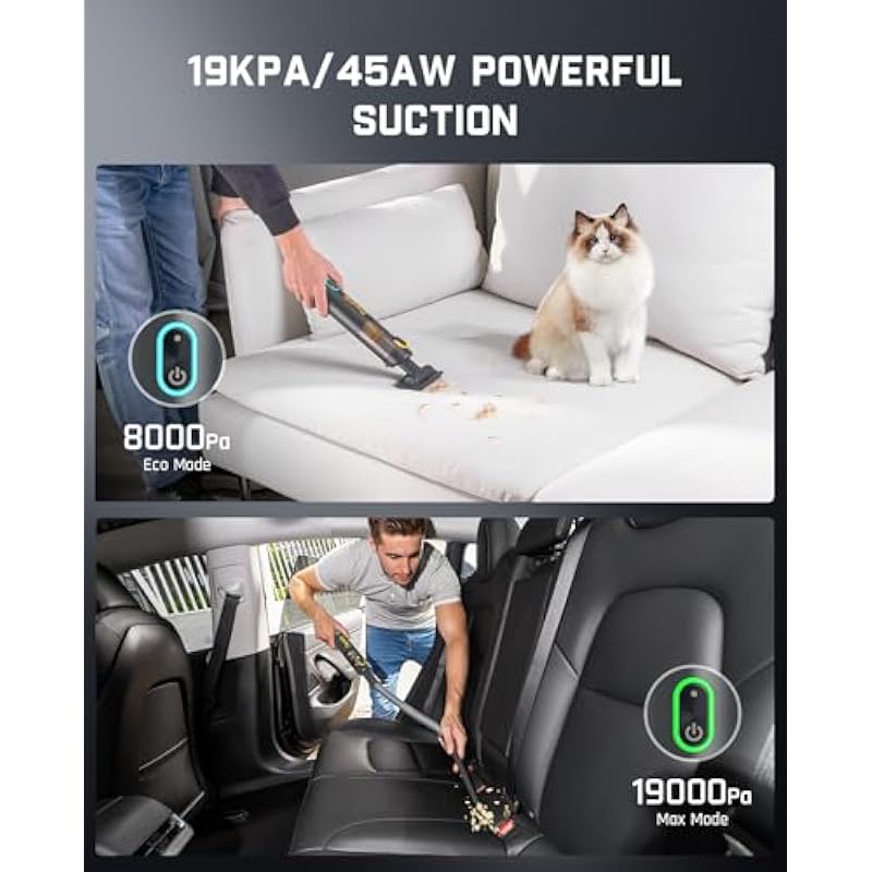 - Unleash 19000Pa Car Vacuum Cleaner High Power: 80000rpm brushless motor provides strong suction of Max 45AW/19kPa to easily pick up stubborn sand, dust and debris. Upgraded drive system output high-speed constant airflow, making the car vacuum high power always at peak suction power. Two suction modes, Eco Mode can be used for 40 minutes, Max Mode can be used for 13 minutes. Ideal for car detailing, home cleaning and outdoor use