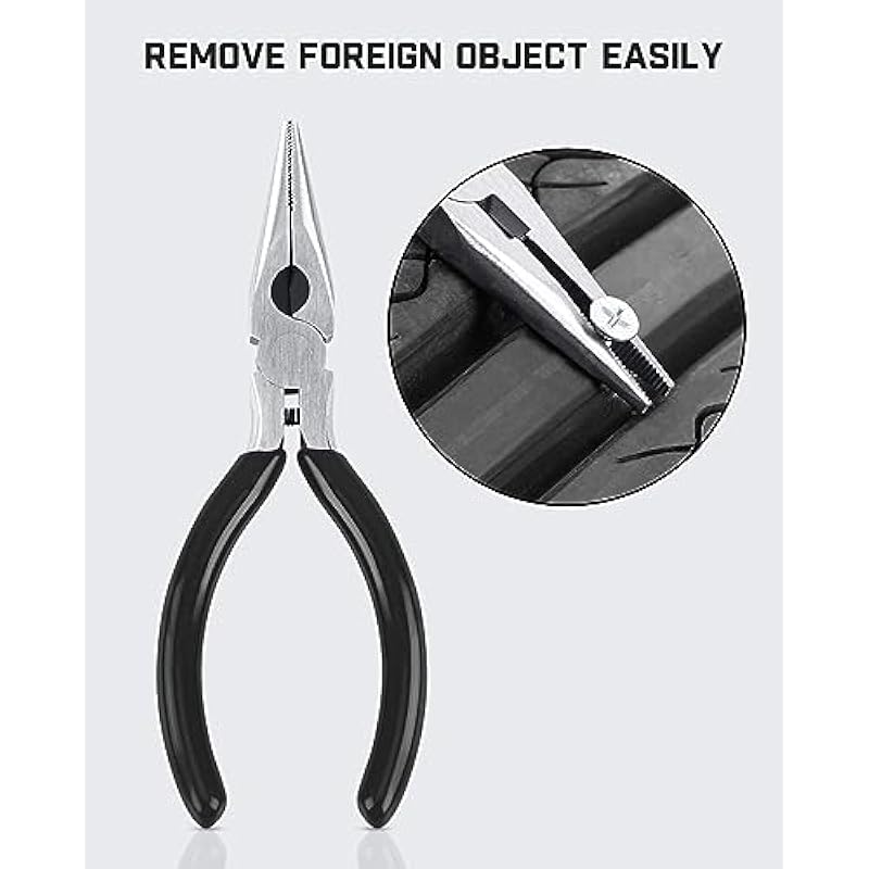 - [Multiple Uses] This kit contains every tool and accessory for tire repair, capable of repairing all tubeless tires in the market. It includes tires of Cars, Trucks, SUVs, Motorcycles, Tractors, Lawn Mowers, Trailers and more.