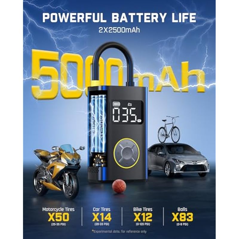 - 【Long Lasting Battery】With its built-in 5000mAh (2*2500mAh) large-capacity battery offering long life and cooling system, it can continuously work for up to 23 mins without shut-off. 【Easy Control with Convenient Auto-stop】With its 4+N intelligent modes, it effortlessly caters to a range of inflation tasks. Whether you’re inflating your car tires, motorcycle tires, bike tires, or sports balls, or need precise manual control, the X9 Pro has got you covered. When it hits the preset pressure level,
