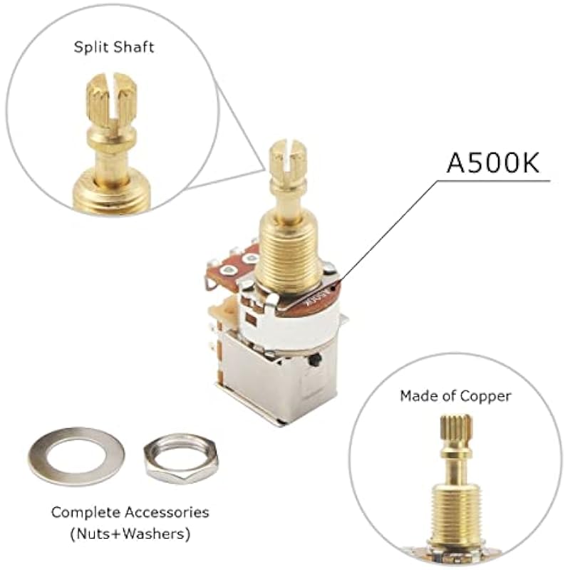 - A Type(Audio Taper), full resistance is 500K ohm, push-push pot & DPDT switch, with solder terminals.