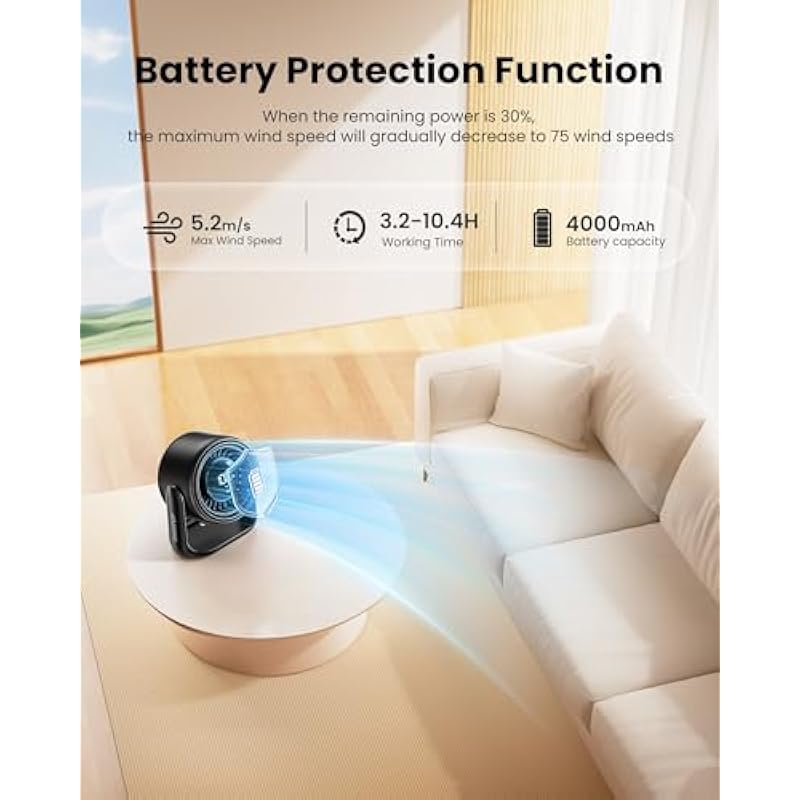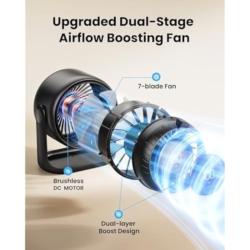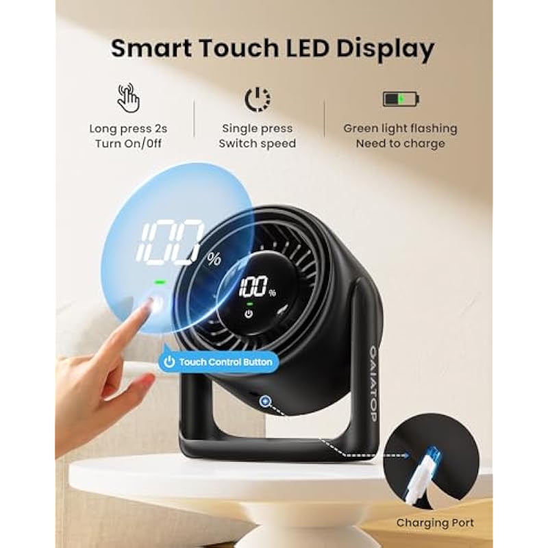 | Special Feature | 90° Adjustable Tilt & Space-Saving Design, Dual-Stage Turbo Boost & 7-Blade Design, Sleek Touch-Sensitive LED Control Desk Fan, USB C Rechargeable Long-Lasting 4000mah Battery, Ultra-Quiet & Energy-Efficient Operation |