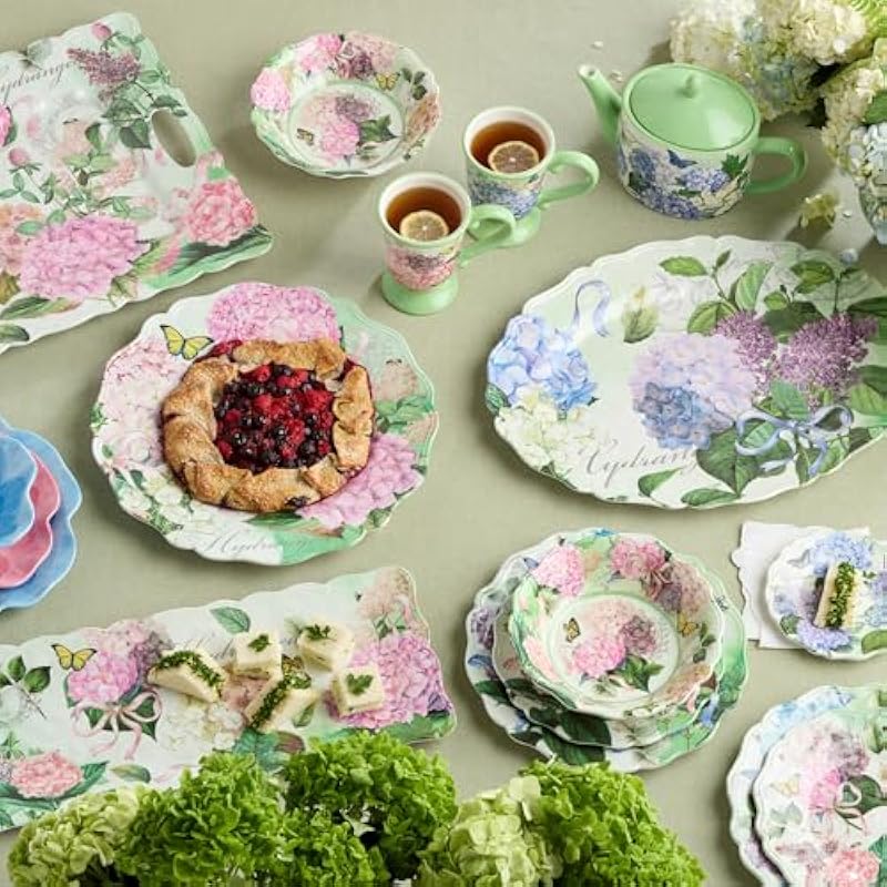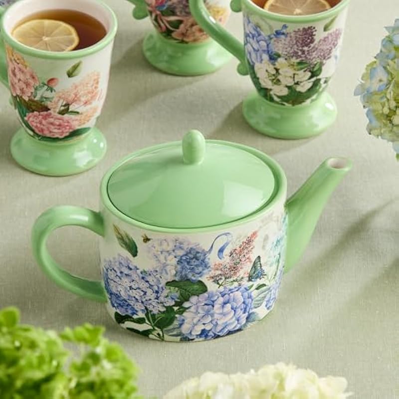 Garden Path 40 oz. Ceramic Teapot with Pink, Purple, and White Hydrangea Design, Butterfly Accents ideal for gatherings, family breakfasts, or quiet moments of self-care.