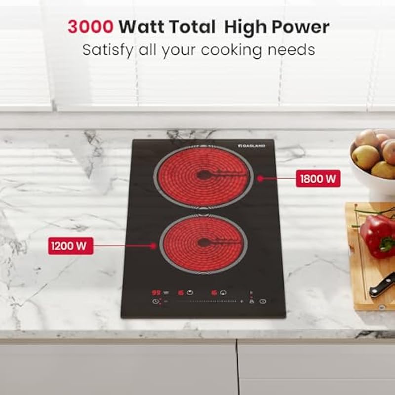 - 【Double Independent Heating Zones】 GASLAND 12 inch electric cooktop features two independent heating zones (1200W and 1800W) that allow you to cook multiple dishes at once. With its powerful 3000W output, this electric stovetop meets all your cooking needs, such as braise, fry, simmer, steaming, boil, stir-frying, roast.