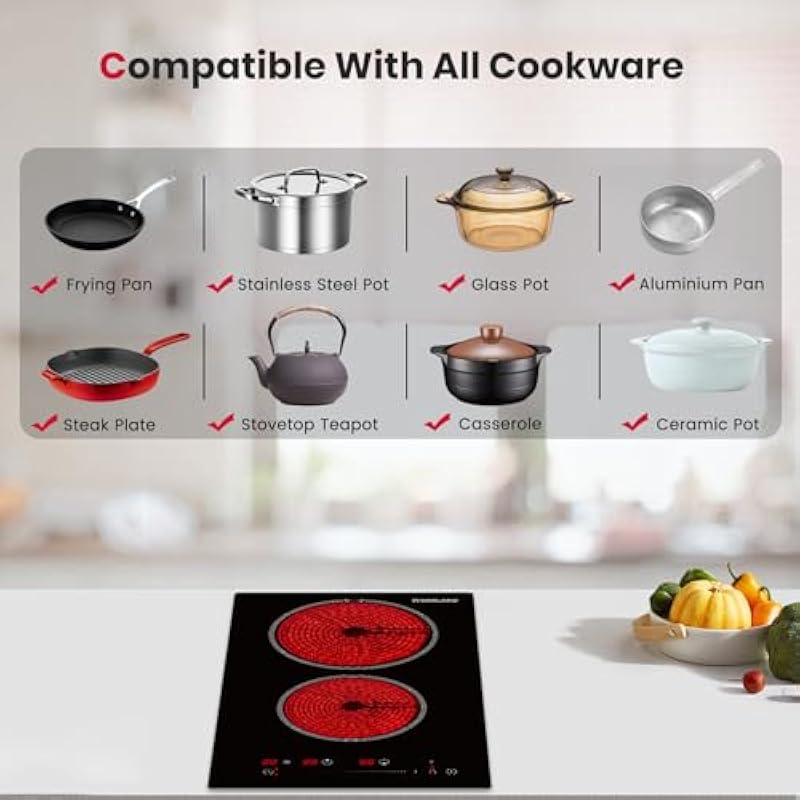 - 【Compatible with Any Cookware】The electric stove top is suitable for various pots such as stainless steel, cast iron frying, aluminum, copper and non-magnetic pans. On a 2 burners electric cooktop heat transfer efficiency up to 60-70%. More choice, shorter time to wait.