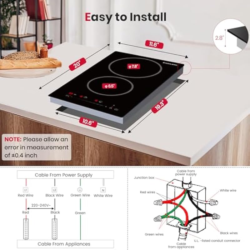 - 【240V Drop-in Electric Cooktop】This built-in electric hob is a high power appliance, suitable for 240v, there is no plug. Please find a qualified person to install it.Product size: 11.6” x 20.0” x 2.8”. Cut out size: 19.29” x 10.63”. Please make sure your cut out size before purchasing.