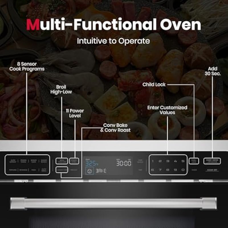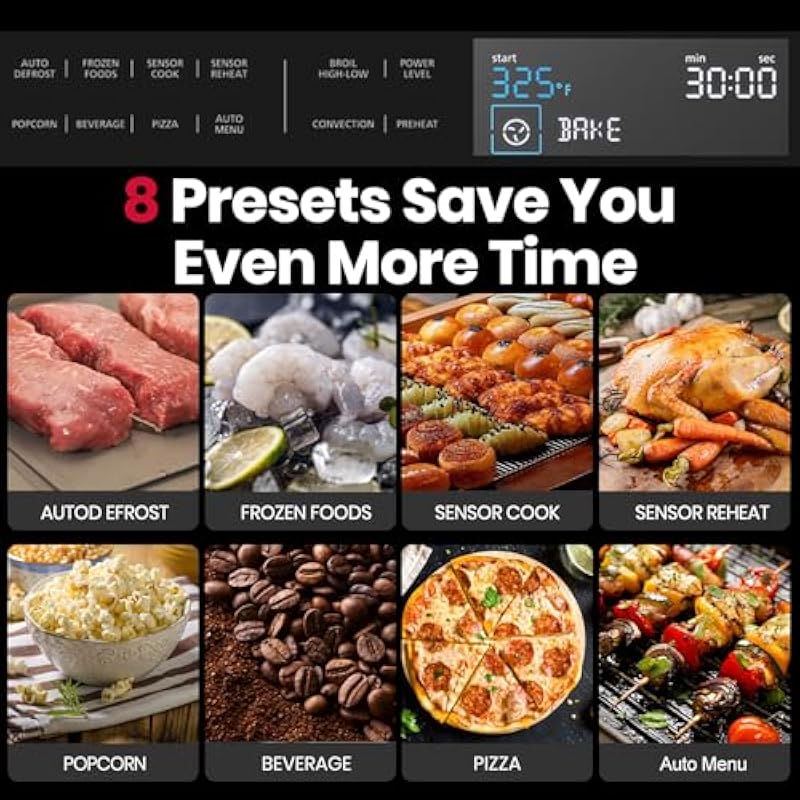 - 【One Touch Cooking】Equipped with 8 auto cook programs: popcorn, pizza, beverage, sensor cook, sensor reheat, auto defrost, frozen foods and auto menu, which cooking various recipes is as easy in just one smart touch with its pre-programmed menus. Kindly note: The control panel protective film can be peeled off.