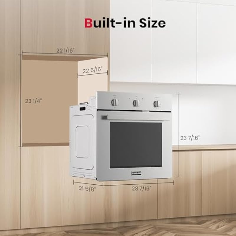 - 【2.79 Cu.ft Family-Size Capacity】With a spacious 2.79 cu.ft (79L) interior and two included racks, this electric wall oven is ideal for family gatherings, holiday baking, and batch meal prep. External size: 23 7/16″ (W) x 23 7/16″(H) x 21 5/8″(D); Built-in size: 22 1/16″(W)x 23 1/4″(H)x 22 5/16″(D)—designed to fit most standard kitchen cabinets.